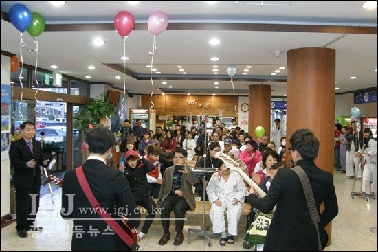 ȯÀÚ¿Í º¸È£ÀÚµéÀº º´¿ø·Îºñ¿¡¼ ¿¸®´Â À½¾Çȸ°¡ ¾ÆÁ÷Àº ³¸¼³¾î óÀ½¿¡´Â ¾î»öÇØÇßÁö¸¸ ±Ý»õ ½Å³ª´Â ¿¬ÁÖ¿Í ¿Ã¢¿¡ µ¿ÈµÇ¸ç ¾ÆÇĵµ ÀØÀº ä ¿À·£¸¸¿¡ ȯÇÏ°Ô ¿ô¾îº¸À̸ç ÀÛÁö¸¸ ½ò½òÇÑ ÇູÀ» ´À³¢´Â µíÇß´Ù.