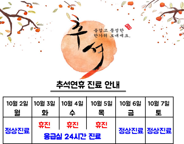 2017³â 10¿ù Ãß¼® ¿¬ÈÞ ¾È³» µå¸³´Ï´Ù. ´ÙÀ½ ³»¿ëÀ» Âü°íÇϽþî Áø·á¿¡ Âø¿À ¾øÀ¸½Ã±æ ¹Ù¶ø´Ï´Ù.³Ë³ËÇÑ Ãß¼® µÇ½Ê½Ã¿ä.